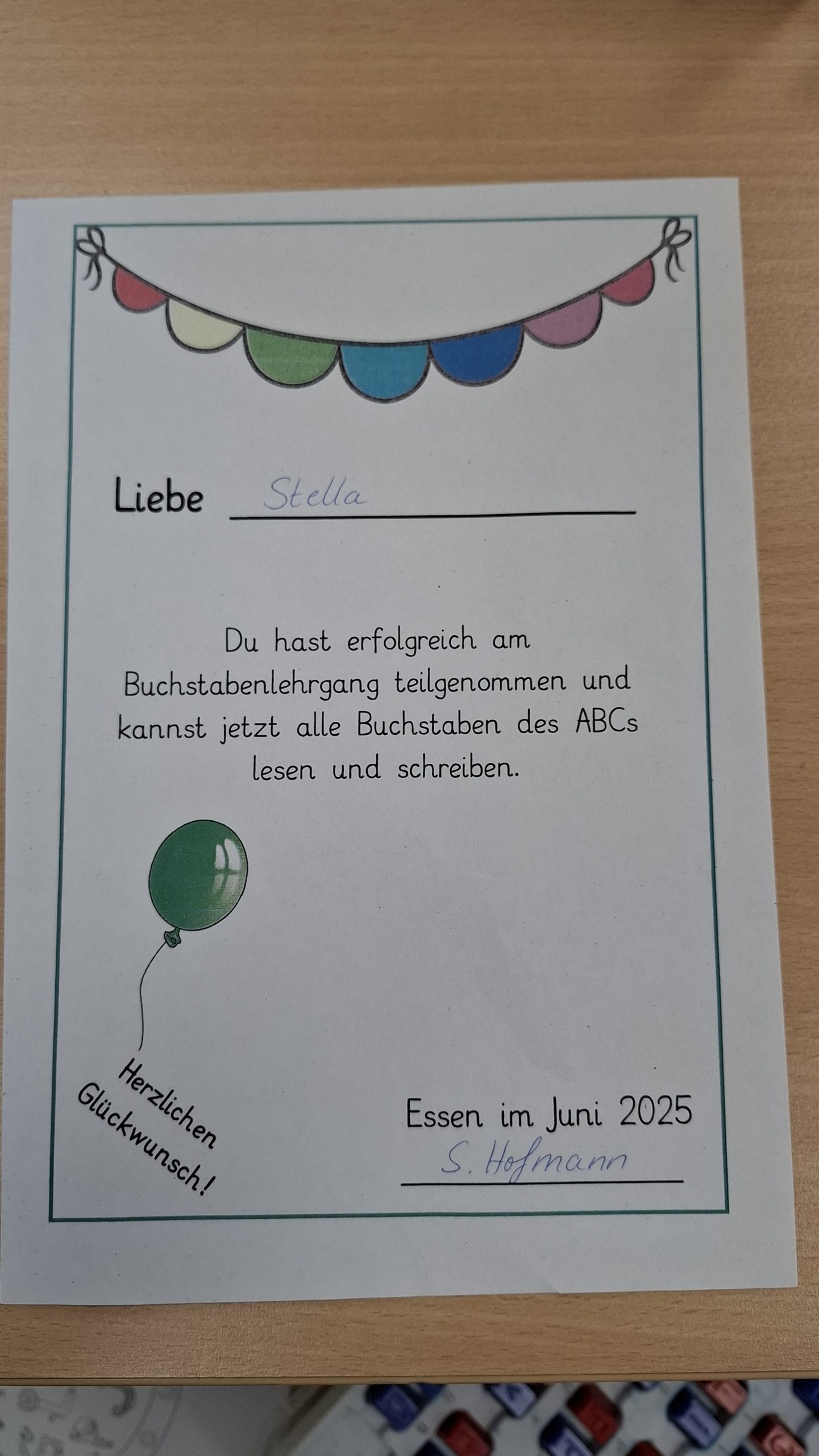 In den Klassen herrschte tolle Stimmung. Die SchülerInnen waren zu Recht sehr stolz auf ihr Gelerntes und erhielten eine wohlverdiente Urkunde. An diesem Tag wurde in den Klassenräumen u.a. gesnackt, an verschiedenen Stationen gearbeitet, Buchstaben geturnt, Buchstabenkronen gebastelt und sich einfach mal gefeiert.