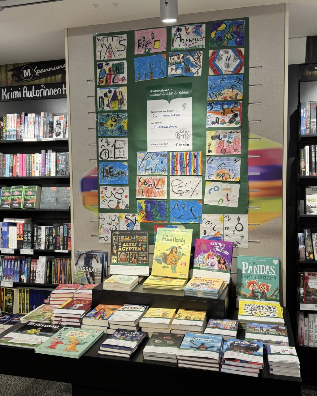 Im Rahmen dieses Projektes machte sich die Klasse auf den Weg zur Thalia Buchhandlung in Rüttenscheid. Dort durfte sich jeder/jede SchülerIn ein Buch seiner/ihrer Wahl als Geschenk aussuchen. In den nächsten 2 Monaten wurde fleißig gelesen, sowohl zu Hause als auch in der Schule. Anschließend wurde mit Unterstützung der Klassenlehrerin von jedem Kind eine kurze Zusammenfassung zum ausgewählten Buch auf Banderole geschrieben. Bis Mitte März befindet sich nun in der Thalia Buchhandlung Rüttenscheid ein Büchertisch der Klasse 2a mit den ausgewählten Büchern und den selbst geschriebenen Rezensionen der SchülerInnen.