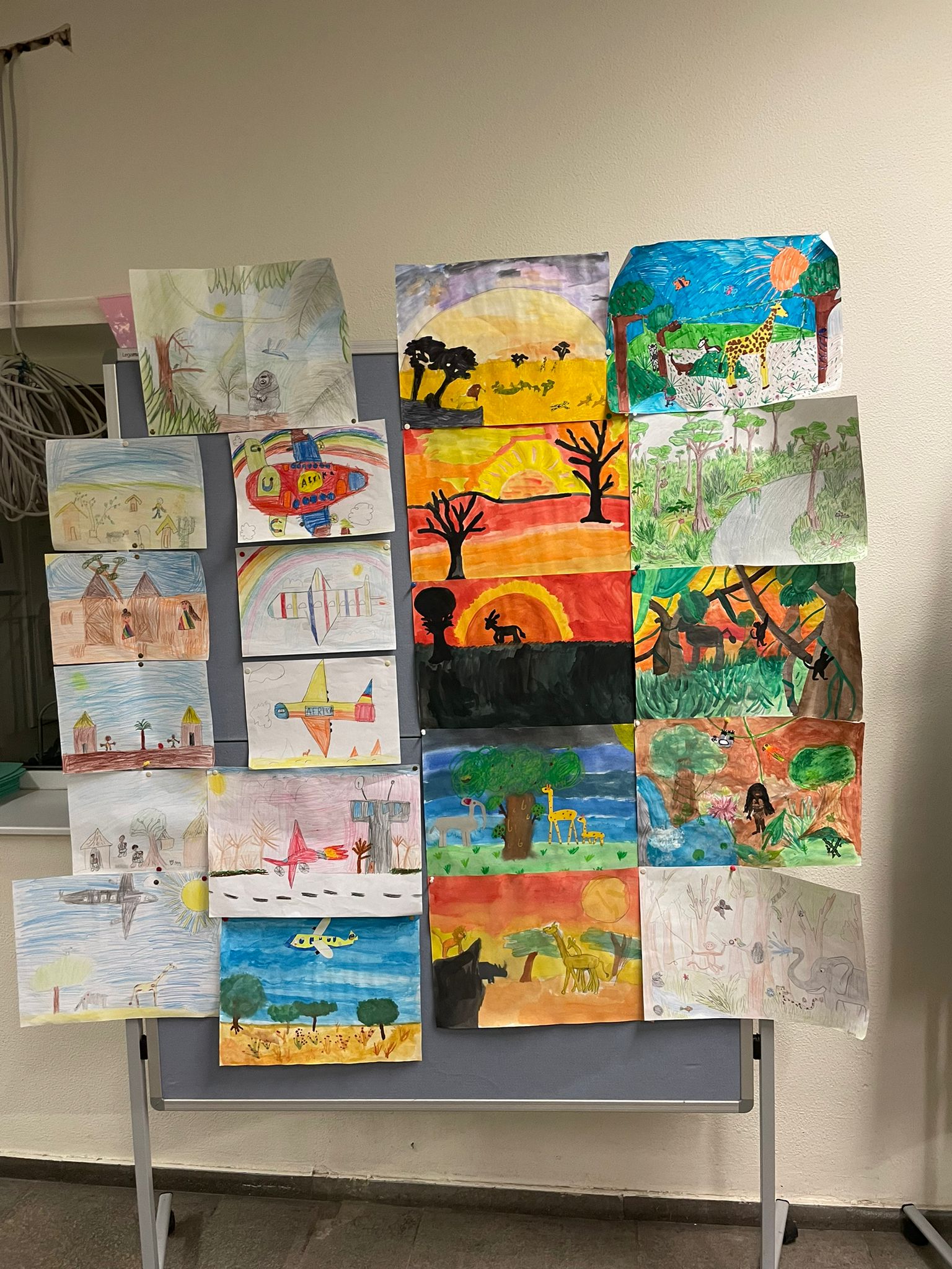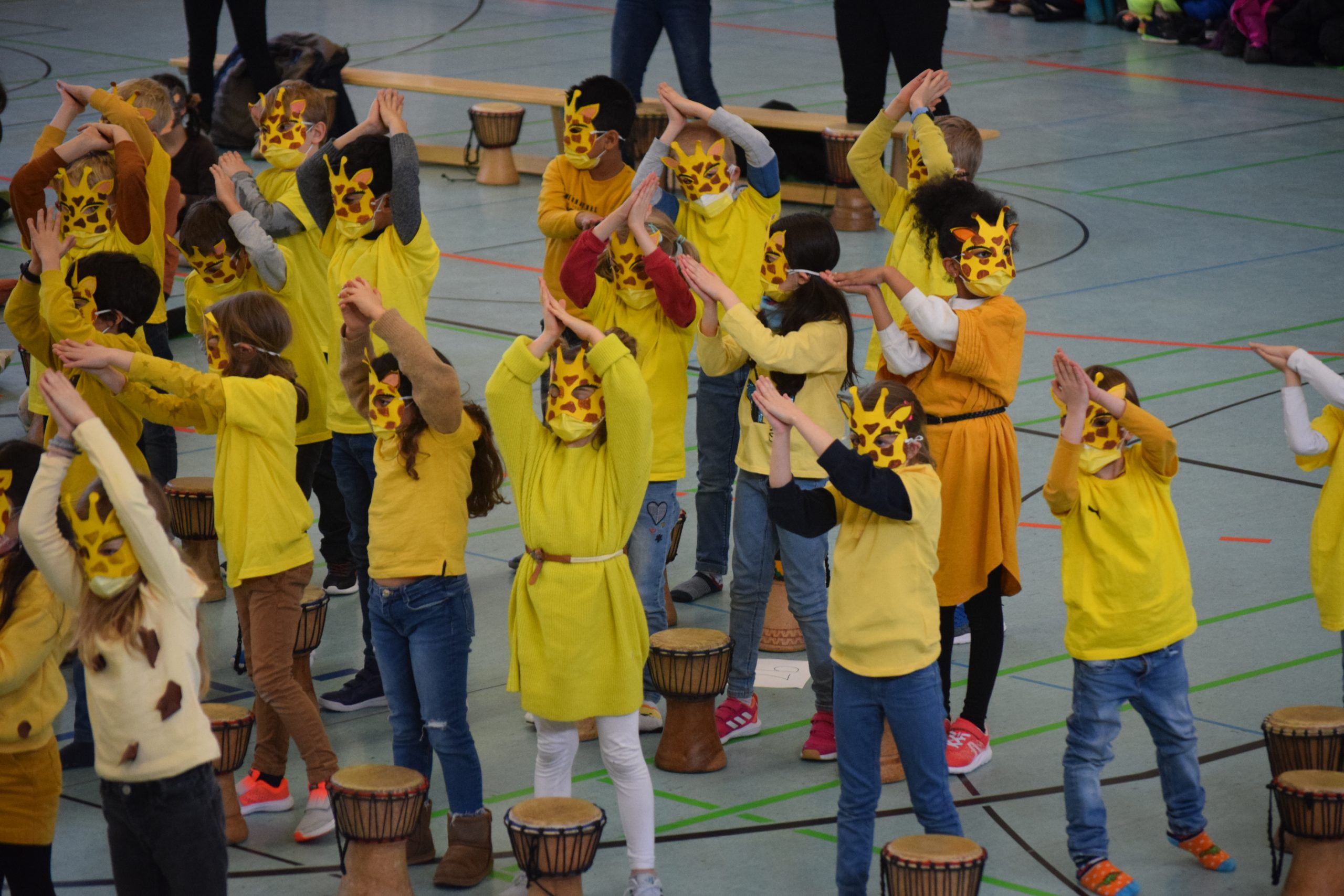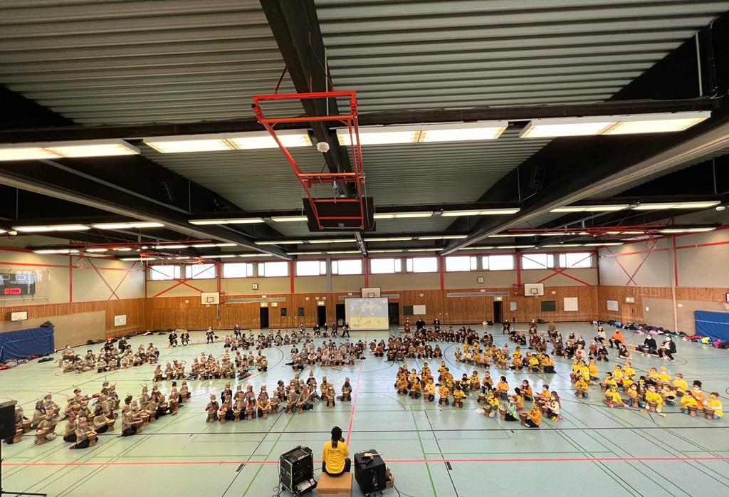 Unter dem Motto „Tambo Tambo“ erlebten alle SchülerInnen und das ganze Team der Andreasschule eine zauberhafte und lebhafte Projektwoche. Verzaubert wurden die SchülerInnen von Fara, der mit seinen über 300 Trommeln die ganze Schulgemeinschaft in einen Rhythmus brachte. An vier Vormittagen wurden jahrgangsweise die afrikanischen Trommelrhythmen erprobt und afrikanischen Lieder geübt. Jeder durfte an seiner eigenen Djembe-Trommel sein Gefühl und seine Begeisterung für Rhythmus kennen lernen. Die ganze Woche stand neben der täglichen Trommelstunde ganz im Zeichen des Kontinents Afrikas. Es wurden Kostüme gebastelt, Länder Afrikas kennen gelernt, Lebensräume und Kulturen erforscht, Tiersteckbriefe erstellt, ein Mallwettbewerb durchgeführt und das Leben in Afrika näher gebracht. Am Freitag folgte dann die Generalprobe und die große Aufführung mit der gesamten Schulgemeinschaft. Passend zum Motto Afrika hatten alle Kinder jahrgangsweise tolle Tiermasken gebastelt und trugen farblich abgestrimmte T-shirts. Eine Flugreise ins Dorf Tamborena stand auf dem Programm und so machten sich die Gazellen (Jahrgang 1), Giraffen (Jahrgang 2), Elefanten (Jahrgang 3) und Affen (Jahrgang 4) auf den Weg. Gleich zu Beginn durften alle Kinder gleichzeitig trommeln. Die Turnhalle des Helmholtz Gymnasium bebte und der Spaß war nicht nur bei den Kindern sehr groß. Leider durfte kein weiteres Publikum unsere große Aufführung live miterleben, aber die Familien haben die Möglichkeit erhalten sich den Auftritt von zu Hause aus im Nachhinein ansehen zu können.